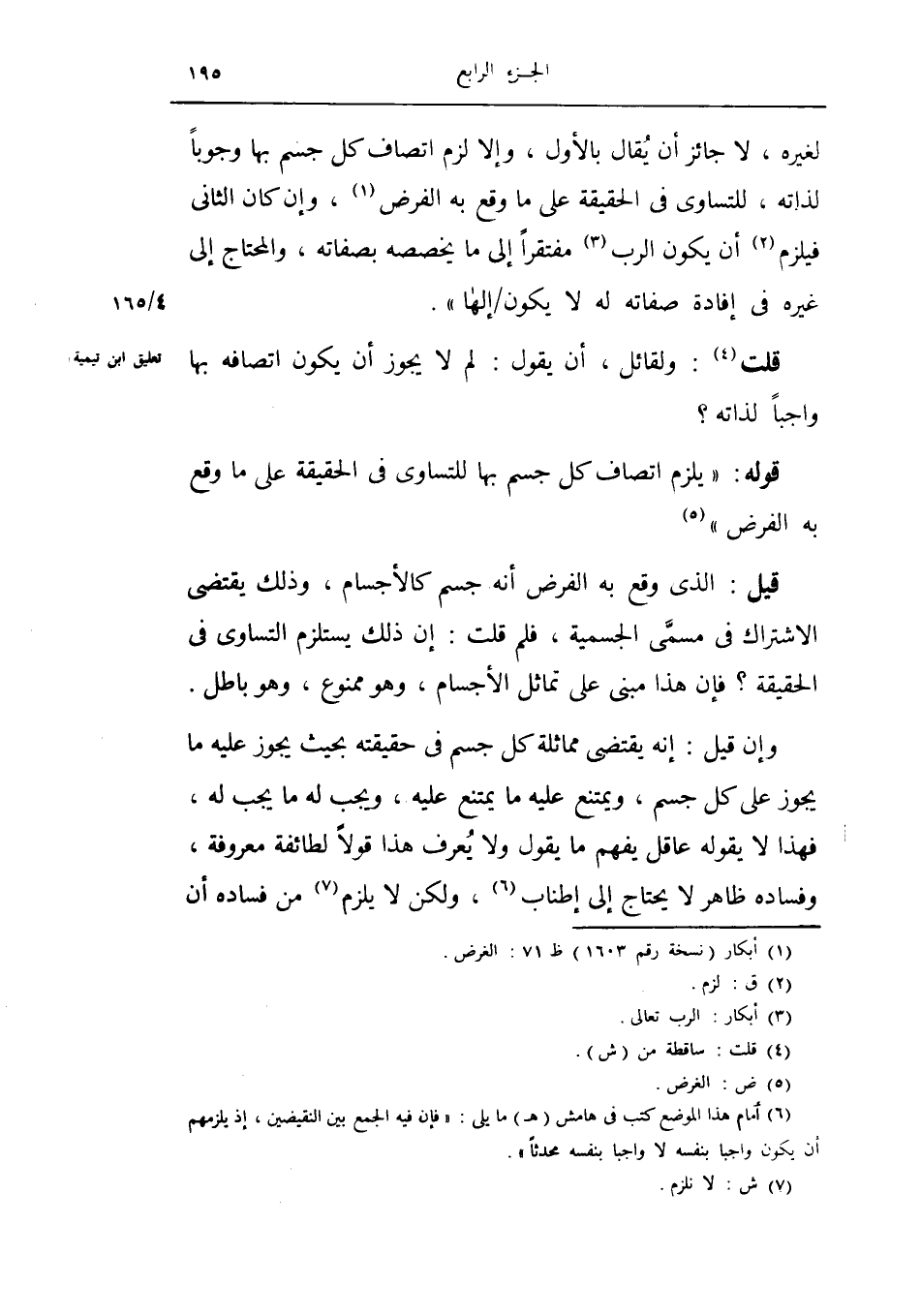 لغيره، لا جائز ان يقال بالأول، وإلا لزم اتصاف كل جسم بها وجوباً لذاته ن للتساوي ف يالحقيقة على ما وقع به الفرض، وإن كان الثاني فيلزم أن يكون الرب مفتقراً إلى ما يخصصه بصفاته، والمحتاج إلى غيره في إفادة صفاته لاه لا يكون إلها.