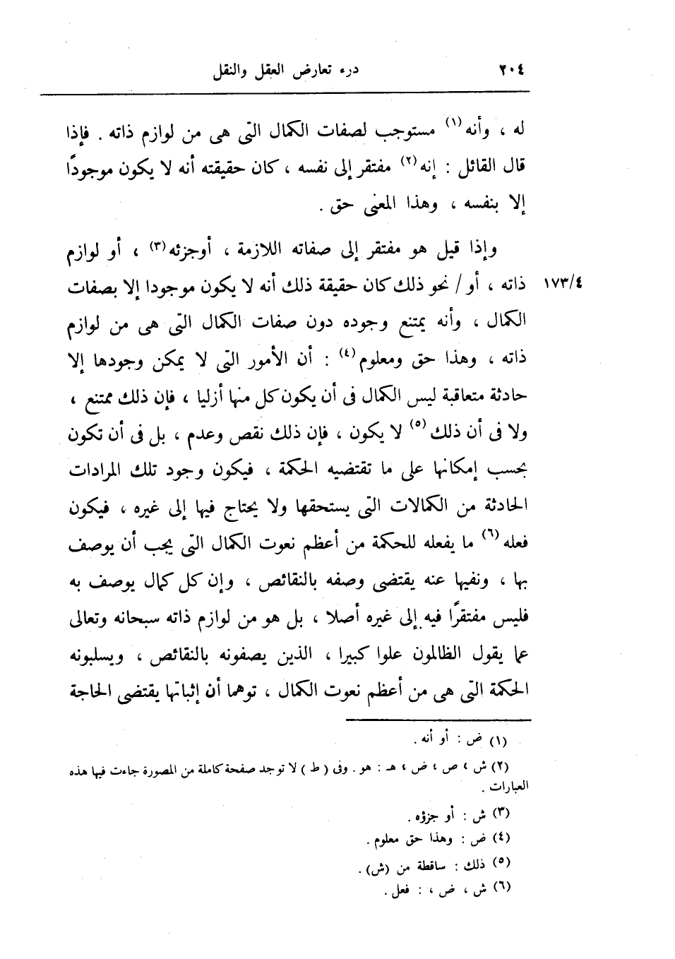 وإذا قيل هو مفتقر إلى صفاته اللازمة أو جزئه أو لوازم ذاته او نحو ذلك كان حقيقة ذلك أنه لا يكون موجودا إلا بصفات الكمال، وأنه يمتنع وجوده دون صفات الكمال التي هي من لوازم ذاته وهذا حق ومعلوم: إن الأمور التي لا يمكن وجودها إلا حادثة متعاقبة ليس الكمال في أن يكون كل منها ازليا فإن ذلك ممتنع ولا في أن ذلك لا يكون، فإن ذلك نقص وعدم، بل في أن تكون كل منها أزليا فإن ذلك ممتنع، ولا في أن ذلك لا يكون، فإن ذلك نقص وعدم، بل في أن تكون بحسب إمكانها على ما تقتضيه الحكمة، فيكون وجود تلك المرادات للحكمة من أعظم نعوت الكمال التي يجب أن يوصف بها، ونفيها عنه يقتضي وصفه بالنقائص، وإن كل كمال يوصف به فليس مفتقراً فيه إلى غيره أصلا، بل هو من لوازم ذاته سبحانه وتعالى عما يقول الظالمون علوا كبيرا، الذين يصفونه بالنقائص ويسلبونه الحكمة التي هي محض