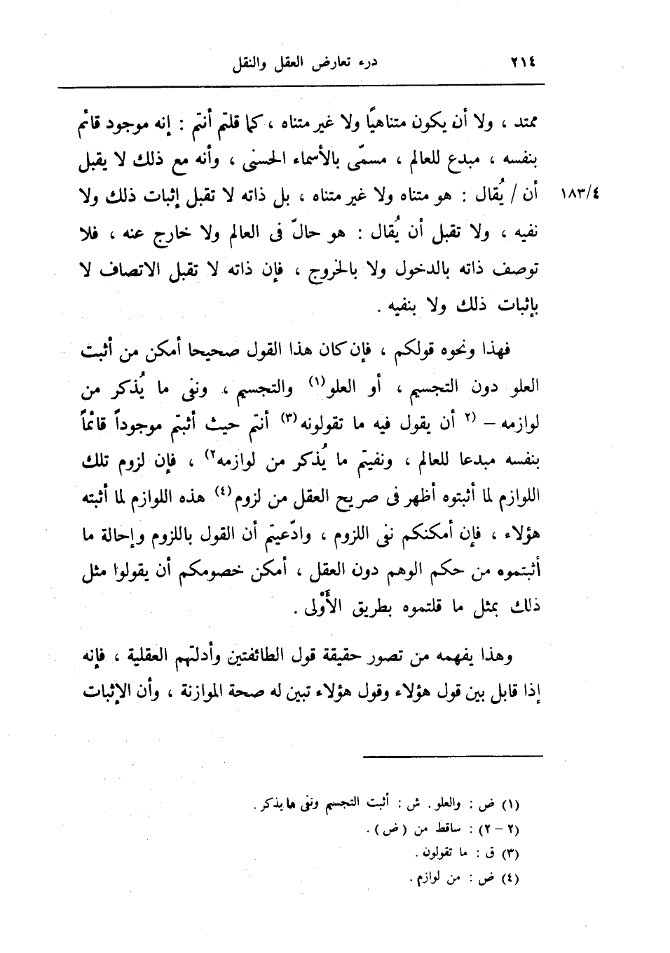 فهذا ونحوه قولكم فغن كان هذا القول صحيحاً أمكن من أثبت العلو دون التجسيم أو العلو والتجسيم ونفي ما يذكر من لوازمه أن يقول فيه ما تقولونه أنتم حيث أثبتم موجوداً قائماً بنفسه مبدعاً للعالم، ونفيتم ما يذكر من لوازمه، فإن لزوم تلك اللوازم لما أثبتوه أظهر في صريح العقل من لزوم هذه اللوازم لما أثبته هؤلاء، فإن أمكنكم نفي اللزوم، وادعيتم أن القول باللزوم وإحالة ما أثبتموه من حكم الوهم دون العقل أمكن خصومكم أن يقولوا مثل ذلك ما قلتموه بطريق الأولي.