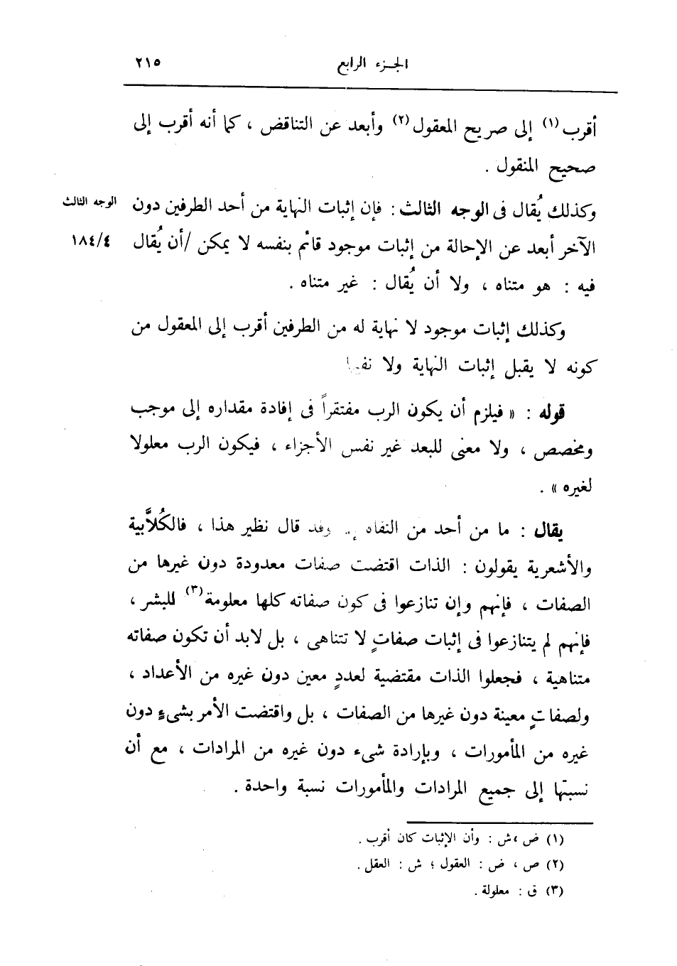 وكذلك يقال في الوجه الثالث فإن لإثبات النهاية من أحد الطرفين دون الآخر أبعد عن الإحالة من إثبات موجود قائم لا يمكن أن يقال فيه هو متناه ولا أن يقال غير متناه.