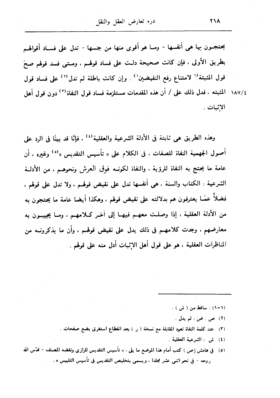 وهذه الطريق هي ثابتة في الأدلة الشرعية والعقلية فإنا قد بينا في الرد على أصول الجهمية النفاة للصفات في الكلام على تأسيس التقديس وغيره أن عامة ما يحتج به النفاة لرؤية والنفاة فرق العرش ونحوهم من الأدلة الشرعية الكتاب والسنة هي نقيض قولهم وهكذا أيضاً عامة ما يحتجون به من الأدلة العقلية إذا وصلت معهم فيها إلى آخر كلامهم وما يجيبون به معارضهم، وجدت كلامهم في ذلك يدل على نقيض قولهم وأن ما يذكرونه من المناظرات العقلية هو على قول أهل الإثبات أدل منه على قولهم.