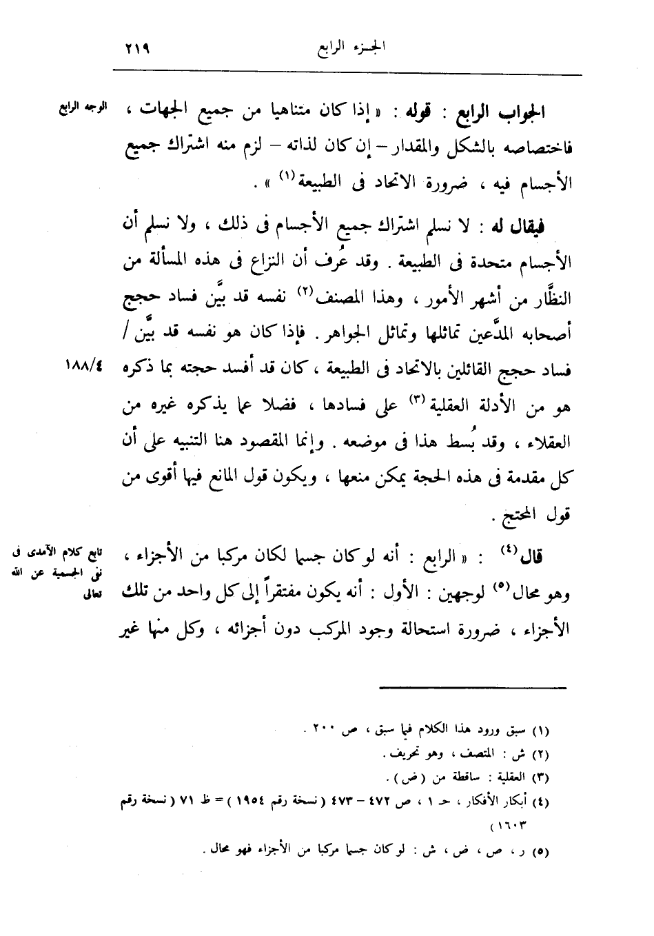 فيقال له لا نسلم اشتراك جميع الأجسام في ذلك ولا نسلم أن االأجسام متحدة في الطبيعة وقد عرف أن النزاع في هذه المسألة من النظار من أشهر الأمور وهذا المصنف نفسه قد بين فساد حجج أصحابه المدعين تماثلها وتماثل الجواهر فإذا كان هو نفسه قد بين فساد حجج أصحابه المدعين تماثلها وتماثل الجواهر.