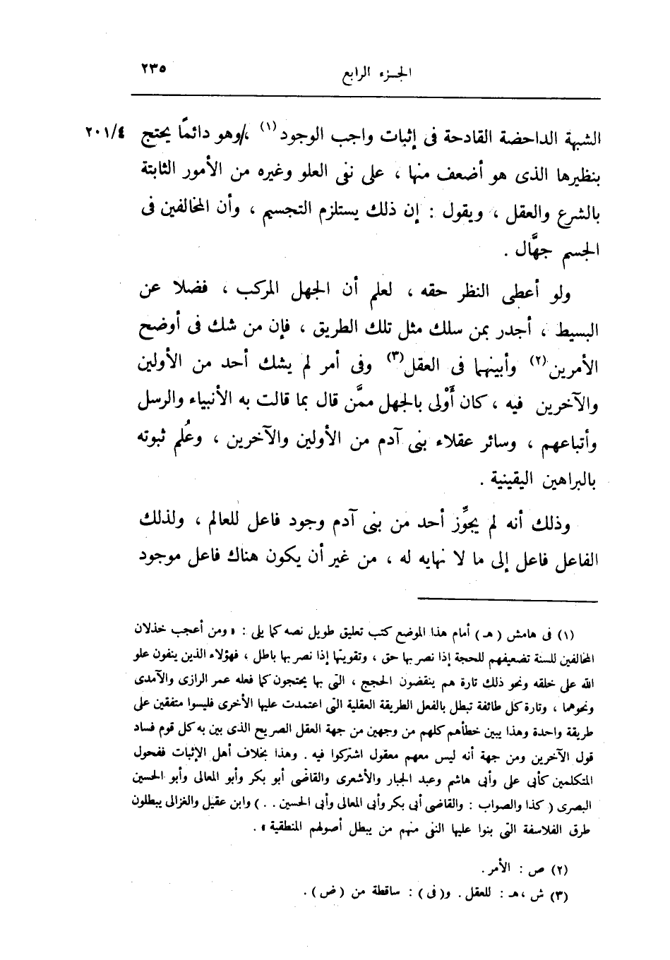 الشبهة الداحضة القادحة في إثبات واجب الوجود هو دائماً يحتج بنظيرها الذي هو أضعف منها على نفي العلو وغيره من الأمور الثابتة بالشرع والعقل ويقول إن ذلك يستلزم التجسيم وأن المخالفين في الجسم جهال.
