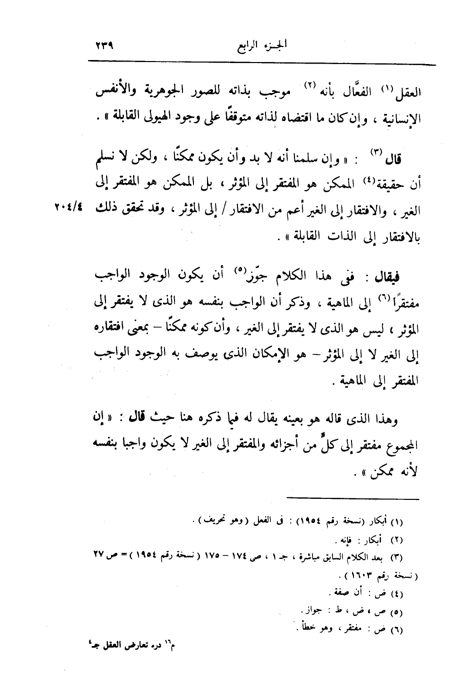 فيقال ففي هذا الكلام جوز أن يكون الوجود الواجب مفتقراً إلى الماهية، وذكر أن الواجب بنفسه هو الذي لا يفتقر إلى المؤثر ليس هو الذي لا يفتقر إلى الغير، وإن كونه ممكناً بمعنى افتقاره إلى الغير لا إلى المؤثر هو الإمكان الذي يوصف به الوجود الواجب المفتقر إلى الماهية.