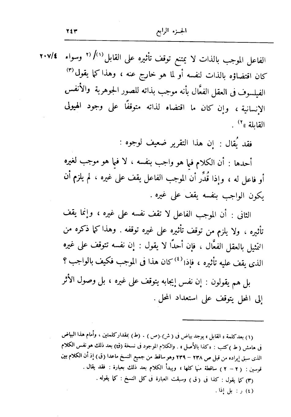 الفاعل الموجب بالذات لا يمتنع توقف تأثيره على القابل وسواء كان اقتضاؤه بالذات لنفسه أو لما هو خارج عنه وهذا كما يقول الفيلسوف في العقل الفعال بأنه موجب بذاته للصور الجوهرية والأنفس الإنسانية وإن كان ما اقتضاه لذاته متوقفاً على وجود الهيولى القابلة.