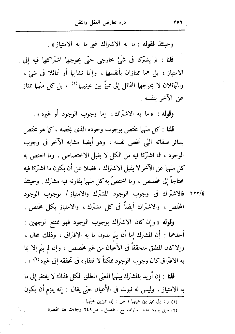 وقوله: إن كان الاشتراك بوجوب الوجود فهو ممتنع لوجهين: الوجه الأول: أن المشترك غما أن يتم بدون ما به الافتراق، وذلك محال، وإلا كان المطلق متحققاً في الأعيان من غير مخصص وإن لم يتم إلا بما به الافتراق كان وجوب الوجود ممكناً لافتقاره في تحققه إلى غيره.