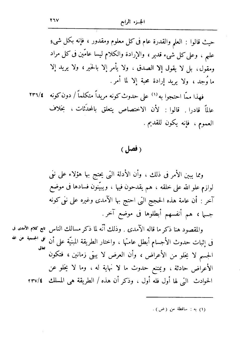 ومما يبين الأمر في ذلك، وان الأدلة التي يحتج بها هؤلاء على نفي لوازم علو الله على خلقه، هم يقدحون فيها، ويبينون فسادها في موضع آخر أن عامة هذه الحجج التي احتج بها الآمدي وغيره على نفي كونه جسماً، هم أنفسهم أبطلوها في موضع آخر.