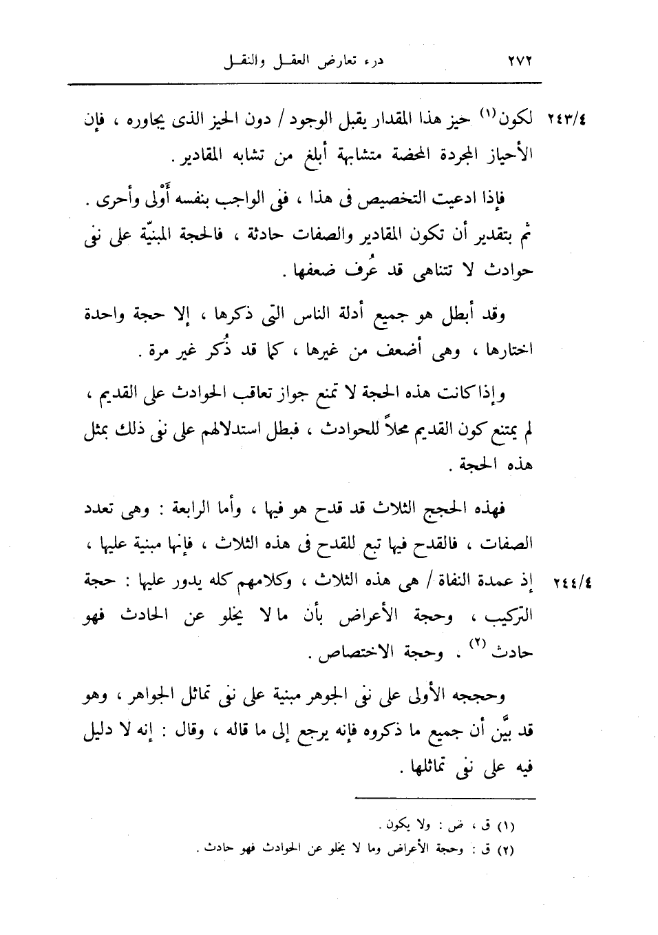 فإذا ادعيت التخصيص في هذا ففي الواجب بنفسه اولى وأحرى ثم بتقدير ان تكون المقادير والصفات حادثة فالحجة المبنية على نفي حوادث لا تناهي قد عرف ضعفها وقد أبطل هو جميع أدلة الناس التي ذكرها إلا حجة واحدة اختارها وهي أضعف من غيرها كما قد ذكر غير مرة.