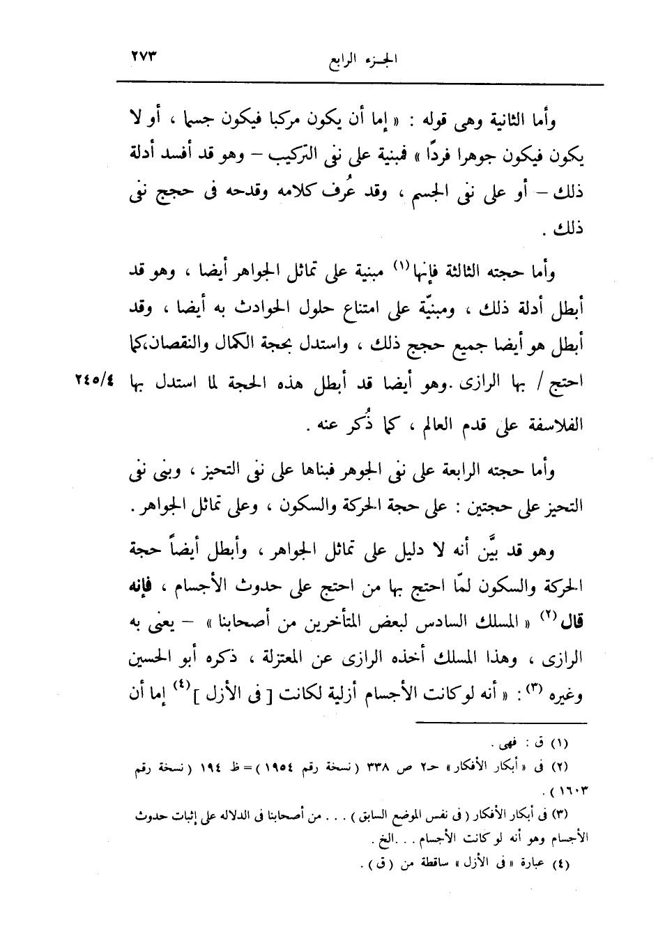 وهو قد بين انه لا دليل على تماثل الجواهر، وأبطل أيضاً حجة الحركة والسكون لما أحتج بها من احتج على حدوث الأجسام، فإنه قال المسلك السادس لبعض المتأخرين من أصحابنا يعني به الرازي وهذا المسلك آخذ الرازي عن المعتزلة، ذكره أبو الحسين وغيره: أنه لو كانت الأجسام أزلية لكانت في الأزل إما أن