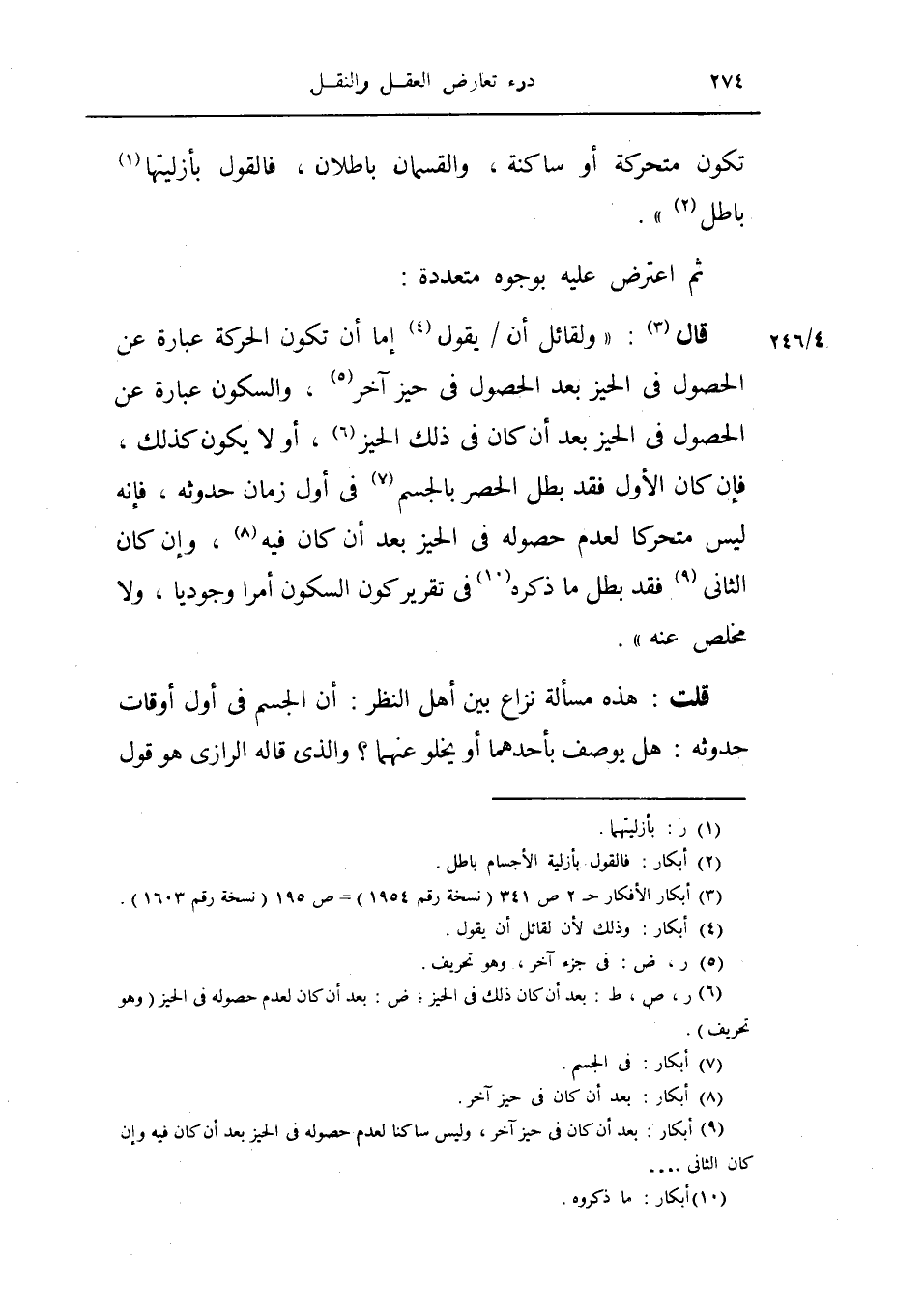 قلت: هذه مسألة نزاع بين أهل النظر: أن الجسم في أوقات حدوثه: هل يوصف بأحدهما أو يخلو عنهما؟ والذي قاله الرازي هو قول
