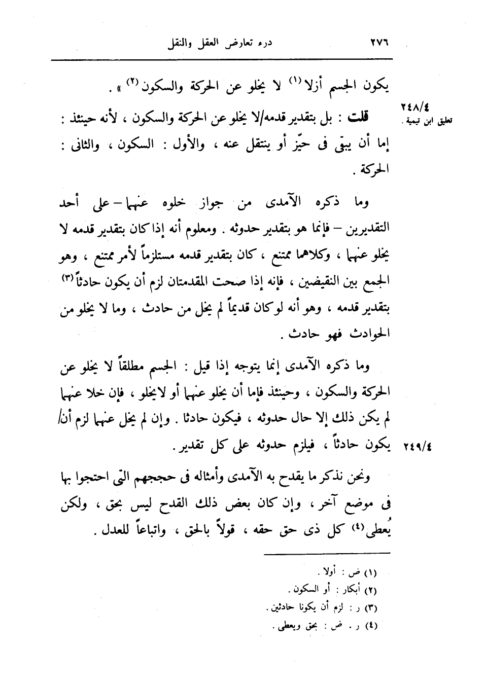 وما ذكره الآمدي من جواز خلوه عنهما على أحد التقديرين فإنما هو بتقدير حدوثه ومعلوم انه إذا كان بتقدير قدمه لا يهخلو عنهما، وكلاهما ممتنع كان بتقدير قدمه مستلزما لأمر ممتنع وهو الجمع بين النقيضين فإنه إذا صحت المقدمتان لزم أن يكون حادثاً بتقدير قدمه وهو انه لو كان قديماً لم يخل من حادث وما لا يخلو من الحوادث فهو حادث.