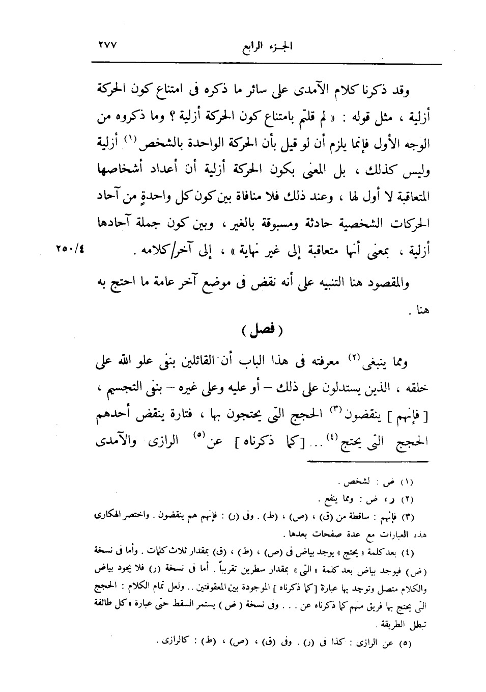 وقد ذكرنا كلام الآمدي على سائر ما ذكره ف يامتناع كن الحركة أزلية، مثل قوله: لم قلتم بامتناع كون الحركة أزلية؟ وما ذكروه من الوجه الأول فإنما يلزم أن لو قيل بأن الحركة الواحدة بالشخص أزلية وليس كذلك، بل المعنى بكون الحركة أزلية أن أعداد أشخاصها المتعاقبة لا أول لها، وعند ذلك فلا منافاة بين كون كل واحدة من آحاد الحركات الشخصية حادثة ومسبوقة بالغير وبين كون جملة آحادها أزلية، بمعنى انها متعاقبة إلى غير نهاية إلى آخر كلامه.