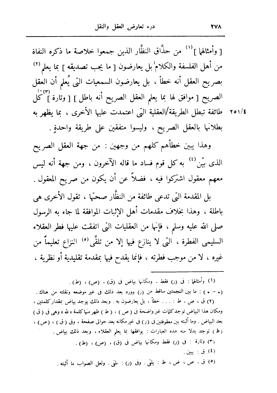 وأمثالهما من حذاق النظار الذين جمعوا خلاصة ما ذكره النفاة من أهل الفلسفة والكلام بل يعارضون ما يجب تصديقه بما يعلم بصريح العقل موافق لها بما يعلم الصريح انه باطل وتارة كل طائفة تبطل الطريقة العقلية التي اعتمدت عليها الأخرى ن بما يظهر به بطلانها بالعقل الصريح وليسوا متفقين على طريقة واحدة.