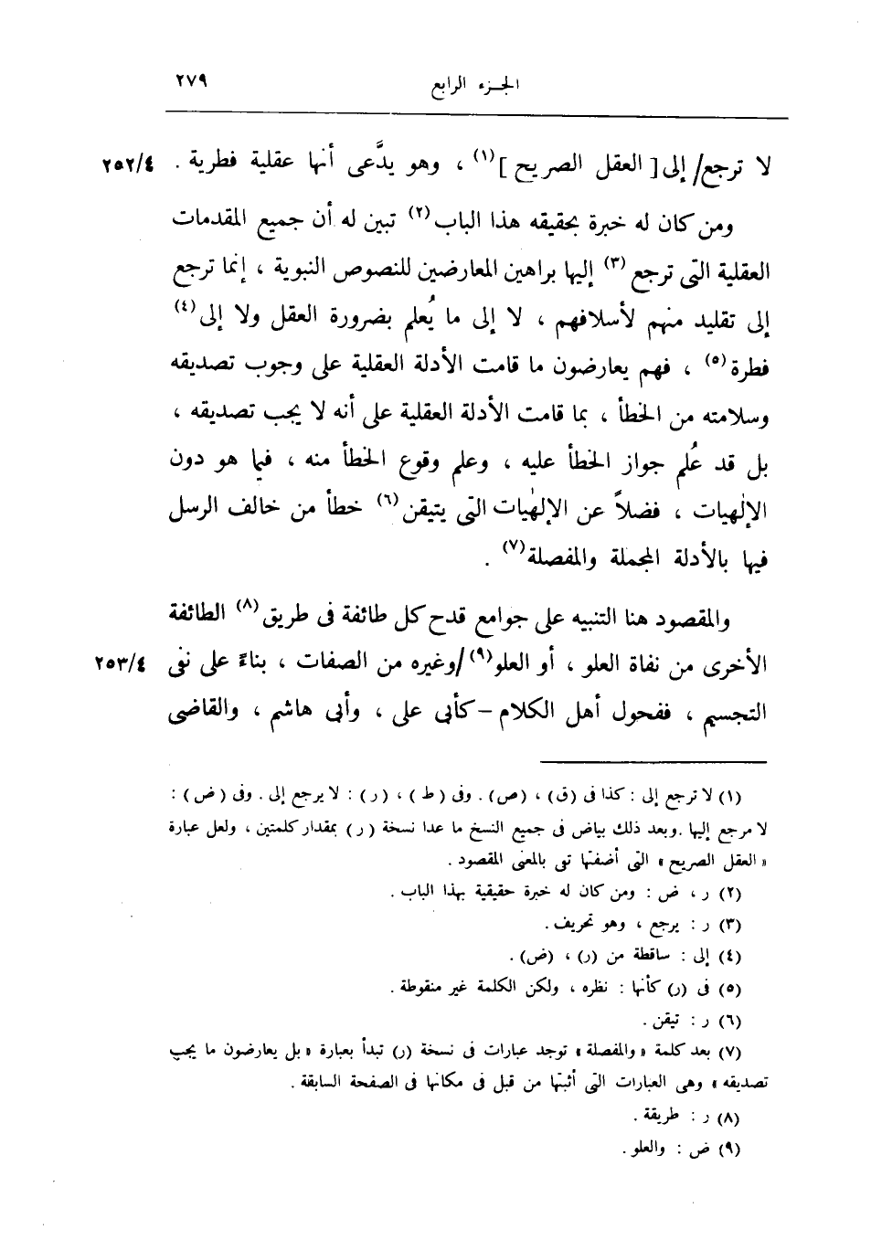 والمقصود هنا التنبيه على جوامع قدح كل طائفة في طريق الطائفة الأخرى من نفاة العلو، أو العلو وغيره من الصفات، بناء على نفي التجسيم، ففحول أهل الكلام كأبي علي وأبي هاشم والقاضي