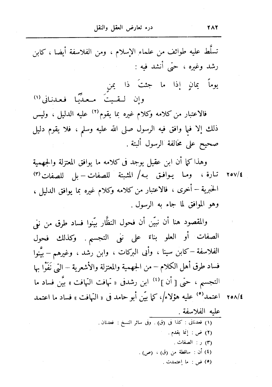 والمقصود هنا أن نبين ان فحول النظار بينوا فساد طرق من نفي الصفات أو لاعلو بناء على نفي التجسيم وكذلك فحول الفلاسفة كابن سينا وأبي البركات وابن رشد وغيرهم بينوا فساد أهل الكلام من الجهمية والمعتزلة والأشعرية التي نفوا بها التجسيم حتى أن ابن رشد في تهافت التهافت بين فساد ما أعتمد هؤلاء كما بين أبو حامد في التهافت فساد ما اعتمد عليه الفلاسفة.