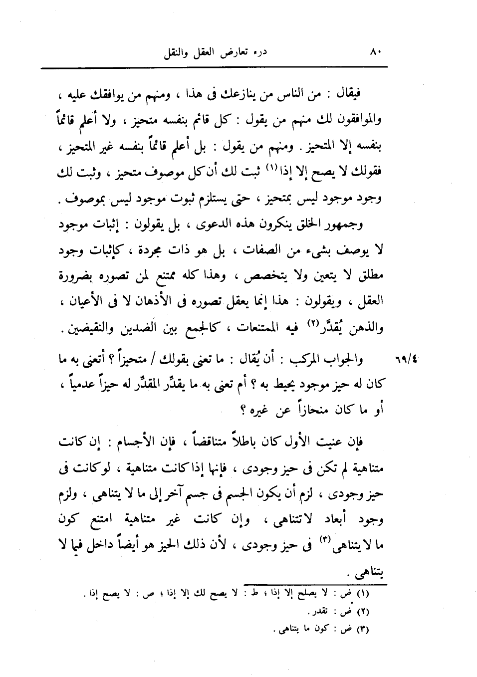 فيقال من الناس من ينازعك في هذا ومنهم من يوافقك عليه والموافقون لك منهم من يقول كل قائم بنفسه متحيز ولا اعلم قائماً بنفسه إلا المتحيز ومنهم من يقول بل أعلم قائماً بنفسه غير المتحيز فقولك لا يصح إلا إذا ثبت لك أن كل موصوف متحيز وثبت لك وجود موجود ليس بمتحيز، حتى يستلزم ثبوت موجود ليس بموصوف