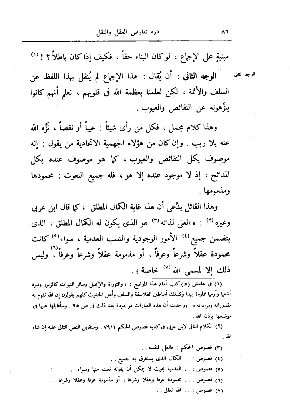 وإن كان من هؤلاء الجهمية الاتحادية من يقول إنه موصوف بكل النقائص والعيوب، كما هو موصوف عنده بكل المدائح إذ لا موجود إلا هو فله جميع النعوت محمودها ومذمومها.