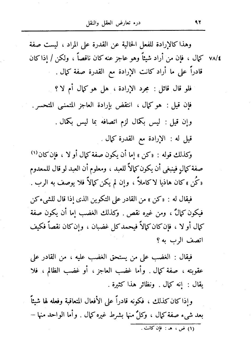وكذلك قوله كن إما أن يكون صفة كمال أولا فإن كان صفة كمال فينبغي أن يكون كمالاً للعبد، ومعلوم أن العبد لو قال للمعدوم كن كان هاذيا لا كاملاً وإن لم يكن كمالاً فلا يوصف به الرب.