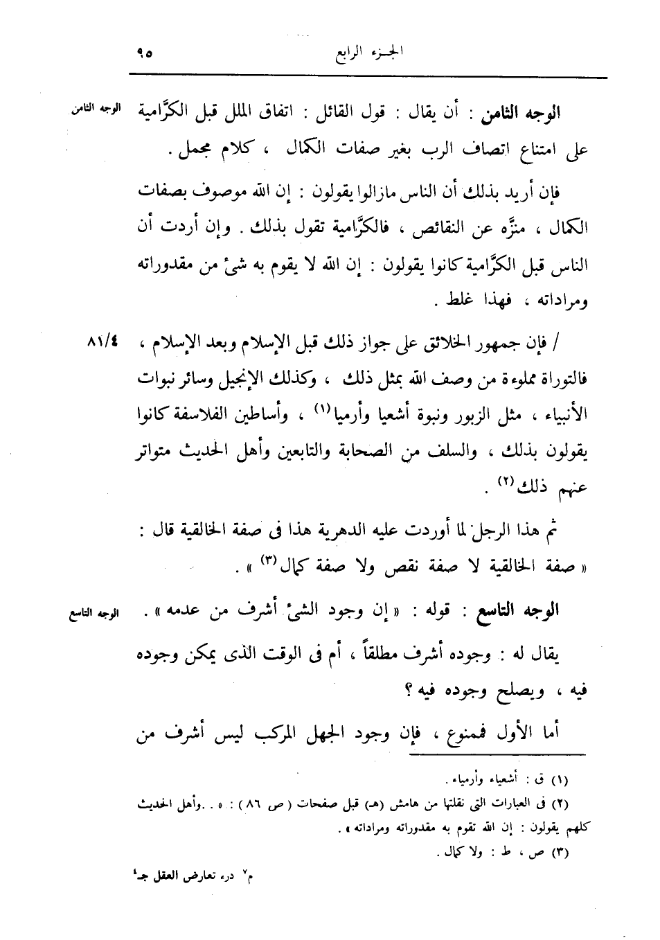 فإن جمهور الخلائق على جواز ذلك قبل الإسلام وبعد الإسلام فالتوراة مملوءة من وصف الله بمثل ذلك وكذلك الإنجيل وسائر نبوات الأنبياء مثل الزبور ونبوة أشعيا وأرميا وأساطين الفلاسفة كانوا يقولون بذلك والسلف من الصحابة والتابعين وأهل الحديث متواتر عنهم ذلك.