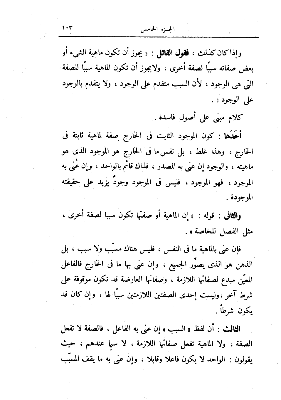 وإذا كان كذلك فقول القائل يجوز أن تكون ماهية الشيء أو بعض صفاته سبباً لصفة أخرى ولا يجوز أن تكون الماهية سبباً للصفة التي هي الوجود لأن السبب متقدم على الوجود ولا يتقدم بالوجود على الوجود.
