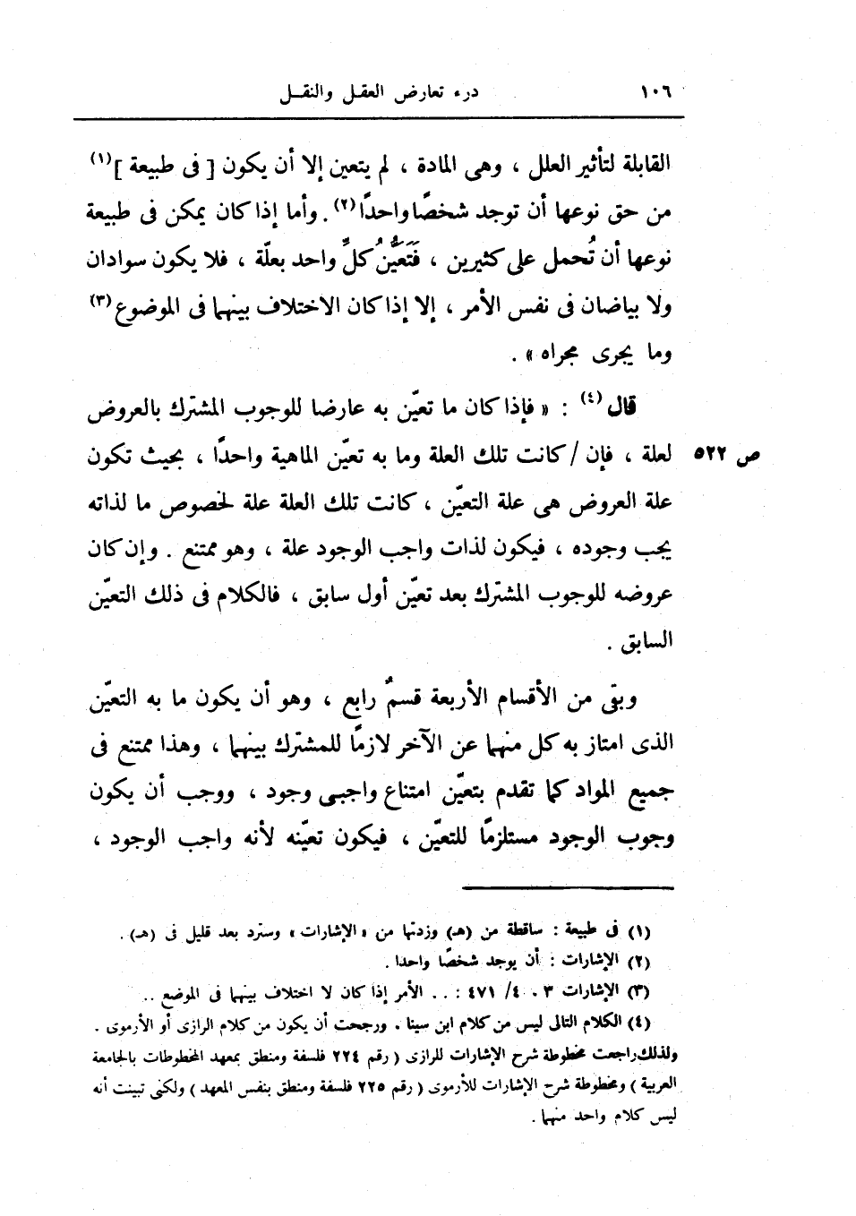 القابلة لتأثير على كثيرين فتعين كل واحد بعلة فلا يكون سوادان ولا بياضان في نفس الأمر إلا إذا كان الاختلاف بينهما في الموضوع وما يجري العلل وهي المادة لم يتعين إلا أن يكون في طبيعة من حق نوعها أن توجد شخصاً واحداً وأما إذا كان يمكن في طبيعة نوعها أن تحمل مجراه.