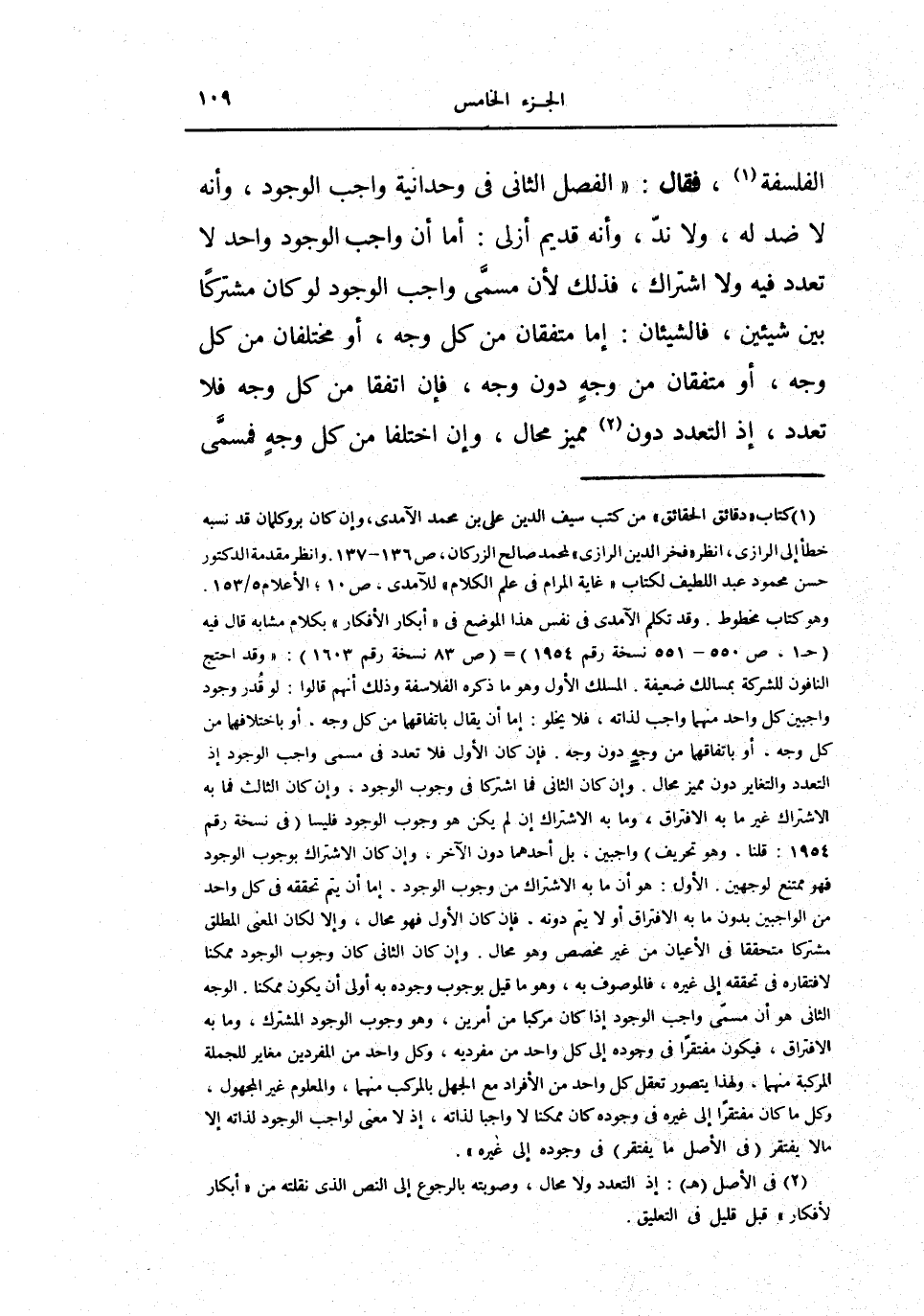 الفلسفة فقال الفصل الثاني في وحدانية واجب الوجود وأنه لا ضد له ولا ند وأنه قديم أزلي أما أن واجب الوجود واحد لا تعدد فيه ولا اشتراك فذلك لأن مسمى واجب الوجود لو كان مشتركاً بين شيئين فالشيئان إما متفقان من كل وجه أو مختلفان من كل وجه أو متفقان من وجه دون وجه فإن اتفقا من كل وجه فلا تعدد إذ التعدد دون مميز محال وإن اختلفا من كل وجه