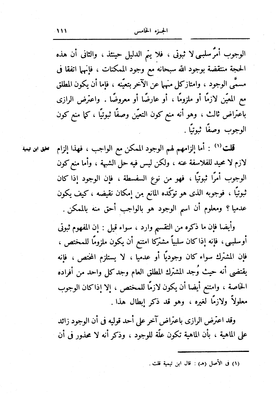 قلت أما إلزامهم لهم الوجود الممكن مع الواجب فهذا إلزام لازم لا محيد للفلاسفة عنه ولكن ليس فيه حل الشبهة واما منع كون الوجوب أمراً ثبوتياً فهو من نوع السفسطة فإن الوجود إذا كان ثبوتياً فوجوبه الذي هو توكده المانع من إمكان نقيضه كيف يكون عدمياً ومعلوم أن اسم الوجود هو بالواجب أحق منه بالممكن.