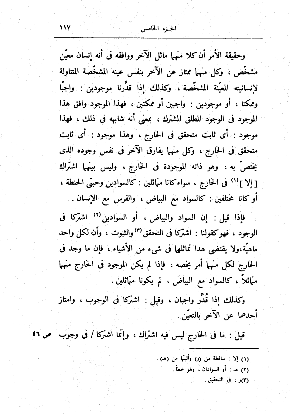 وحقيقة الأمر أن كلاً منهما ماثل الآخر ووافقه في أنه إنسان معين مشخص، وكذلك إذا قدرنا موجودين: واجباً وممكناً، أو موجودين: واجبين أو ممكنين، فهذا الموجود وافق هذا الموجود في الوجود المطلق المشترك، بمعنى انه شابهه في ذلك، فهذا موجود: أي ثابت متحقق في الخارج، وهذا موجود: أي ثابت متحقق في الخارج، وكل منهما يفارق الآخر في نفس وجوده الذي يختص به، وهو ذاته الموجودة في الخارج، وليس بينهما اشتراك إلا في الخارج، سواء كانا متماثلين: كالسوادين وحبتي الحنطة، أو كانا مختلفين: كالسواد مع البياض، والفرس مع الإنسان.