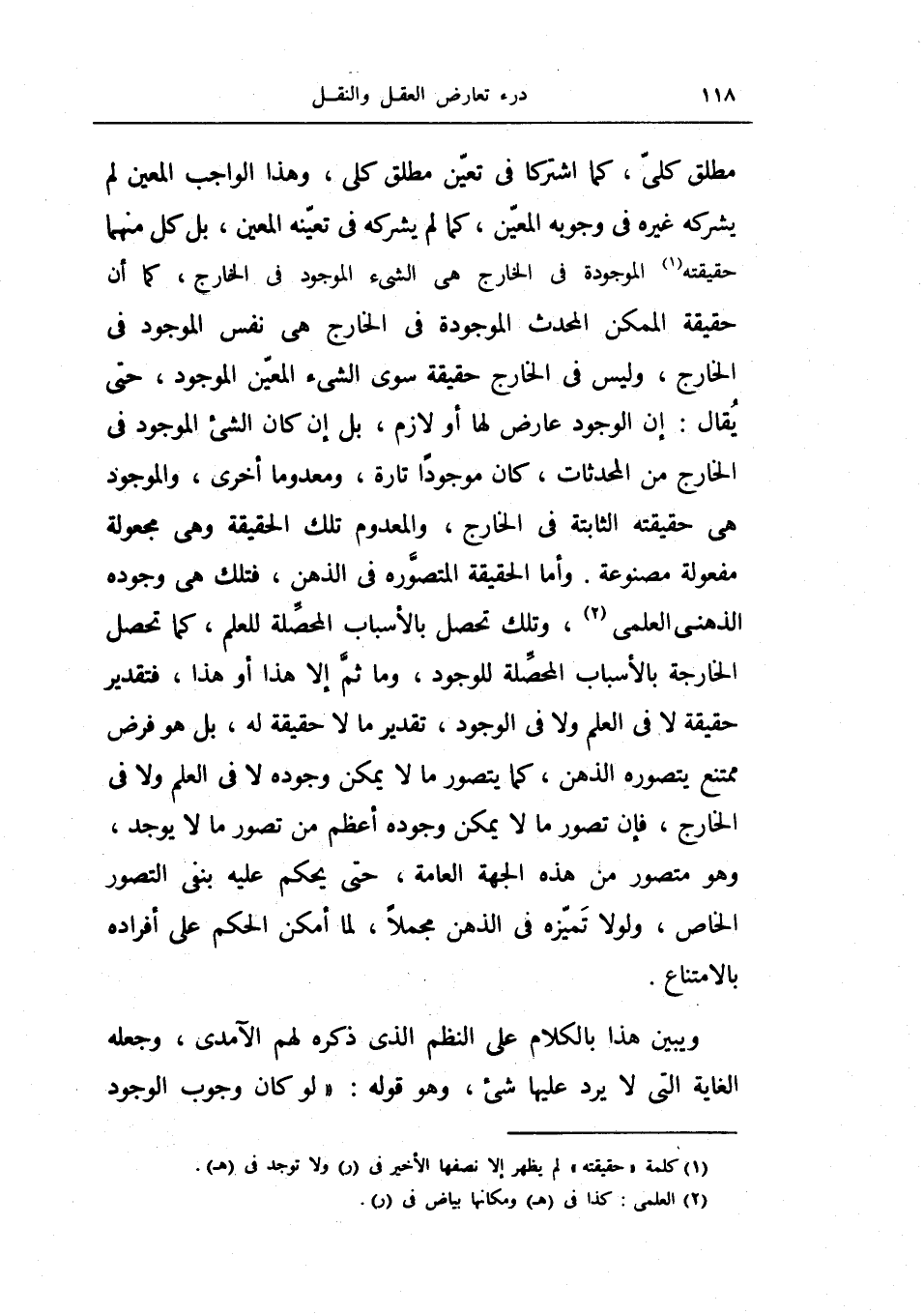 مطلق كلي، كما اشتركا في تعين مطلق كلي، وهذا الواجب المعين لم يشركه غيره في وجوبه المعين، كما لم يشركه في تعينه المعين، بل كل منهما حقيقته الموجودة في الخارج هي الشيء الموجود في الخارج، كما أن حقيقه الممكن المحدث الموجودة في الخارج هي نفس الموجود في الخارج، وليس في الخارج حقيقة سوى الشيء المعين الموجود، حتى يقال: إن الوجود عارض لها أو لازم، بل إن كان الشيء الموجود في الخارج من المحدثات، كان موجوداً تارة، ومعدوماً أخرى، والموجود هي حقيقته الثابتة في الخارج، والمعدوم تلك الحقيقة وهي مجعولة مفعولة مصنوعة، وأما الحقيقة المتصورة في الذهن، فتلك هي وجوده الذهني العلمي، وتلك تحصل بالأسباب المحصلة للعلم، كما تحصل الخارجة بالأسباب المحصلة للوجود، وما ثم إلا هذا أو هذا، فتقدير حقيقة لا في العلم ولا في الوجود، تقدير مالا حقيقة له، بل هو فرض ممتنع يتصوره الذهن، كما يتصور ما لا يمكن وجوده لا في العلم ولا في الخارج، فإن تصور مالا يمكن وجوده أعظم من تصورنا ما لا يوجد، وهو متصور من هذه الجهة العامة، حتى يحكم عليه بنفي التصور الخاص، ولولا تميزه في الذهن مجملاً، لما أمكن الحكم على أفراده بالامتناع.