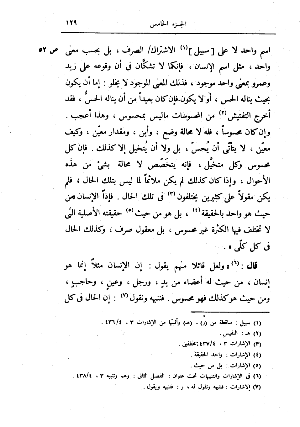 اسم واحد لا على سبيل الاشتراك الصرف بل بحسب معنى واحد مثل اسم الانسان فإنكما لا تشكان في أن وقوعه على زيد وعمرو بمعنى واحد موجود فذلك المعنى الموجود لا يخلو إما أن يكون بحيث يناله الحس أولاً يكون فإن كان بعيداً من أن يناله الحس فقد أخرج التفتيش من المحسوسات ما ليس بمحسوس وهذا أعجب.