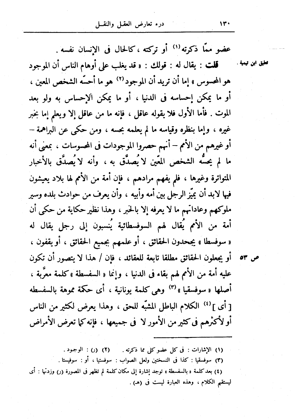 قلت يقال له قولك قد يغلب على أوهام الناس أن الموجود هو المحسوس إما أن تريد أن الوجود هو ما أحس الشخص المعين أو ما يمكن إحساسه في الدنيا أو ما يمكن الإحساس به ولو بعد الموت فأما الأول فلا يقوله عاقل فإنه ما من عاقل إلا ويعلم إما بخبر غيره وإما بنظره وقياسه ما لم يعلمه بحسه ومن حكى عن الراهمة أو غيرهم من الأمم انهم حصروا الموجودات في المحسوسات بمعنى انه ما لم يحسه الشخص المعين لا يصدق به وانه لا يصدق بالأخبار المتواترة وغيرها فلم يفهم مرادهم فإن أمة من الأمم لها بلاد يعيشون فيها لا بد أن يميز الرجل بين أمة وأبيه وأن يعرف من حوادث بلده وسير ملوكهم وعاداتهم ما لا يعرفه إلا بالخبر وهذا نظير إلا بالخبر وهذا نظير حكاية من حكى أن أمة من الأمم يقال لهم السوفسطائية ينسبون إلى رجل يقال له سوفسطا يجحدون الحقائق أو علمهم بجميع الحقائق أو يقفون أو يجعلون الحقائق مطلقاً تابعة للعقائد فإن هذا لا يتصور أن تكون عليه أمة من الأمم لهم بقاء في الدنيا وإنما السفسطة كلمة معربة أصلها سوفسقيا وهي كلمة يونانية أي حكمة مموهة بالسفسطة أي الكلام الباطل المشبه للحق وهذا يعرض لكثير من الناس أو لأكثرهم في كثير من الأمور لا في جميعها فإنه كما تعرض الأمراض