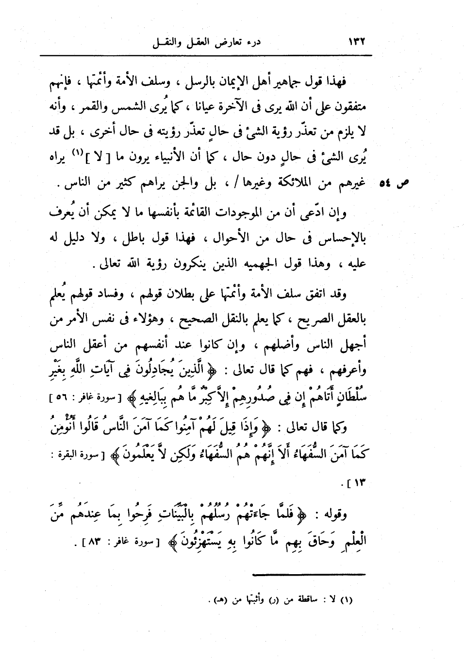 فهذا قول جماهير أهل الإيمان بالرسل، وسلف الأمة وأئمتها، فإنهم متفقون على أن الله يرى في الآخرة عيانا، كما يرى الشمس والقمر، وأنه لا يلزم من تعذر رؤية الشيء في حال تعذر رؤيته في حال أخرى، بل قد يرى الشيء في حال دون حال، كما أن الأنبياء يرون مالا يراه غيرهم من الملائكة وغيرها، بل والجن يراهم كثير من الناس.