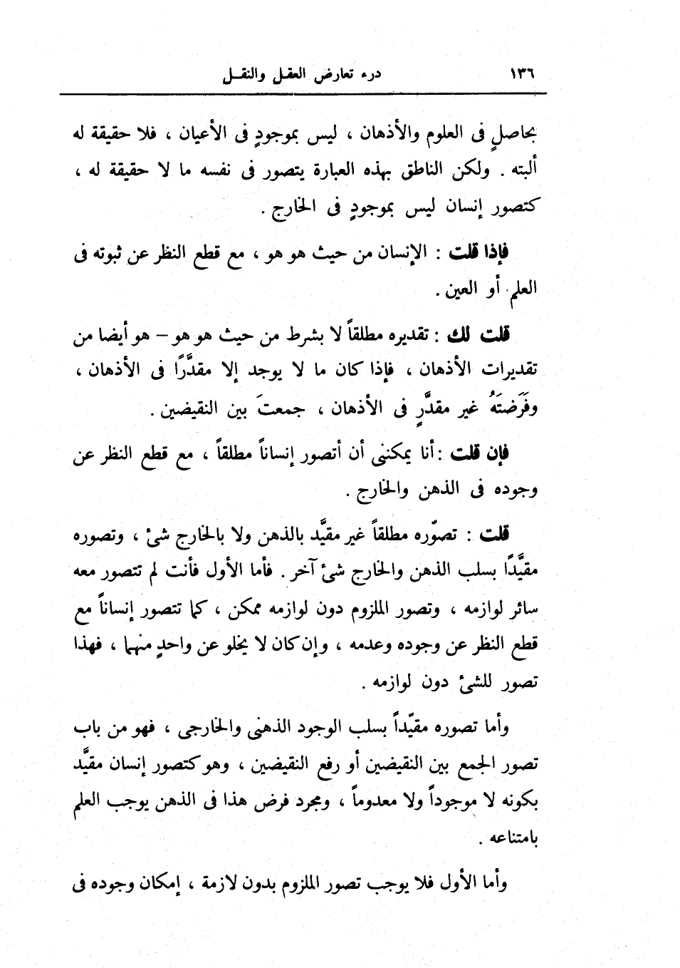 قلت لك: تقديره مطلقاً لا بشرط من حيث هو هو - هو أيضاً من تقديرات الأذهان فإذا كان مالا يوجد إلا مقدراً في الأذهان وفرضته غير مقدر في الأذهان جمعت بين النقيضين.