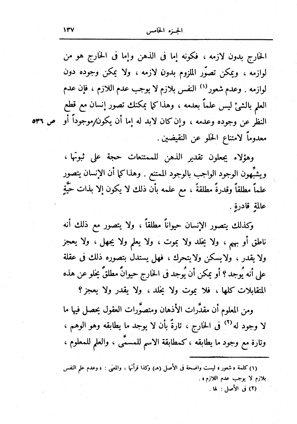 وكذلك يتصور الإنسان حيواناً مطلقاً، ولا يتصور مع ذلك انه ناطق أو بهيم، ولا يخلد ولا يموت، ولا يعلم ولا يجهل، ولا يعجز ولا يقدر، ولا يسكن ولا يتحرك، فهل يستدل بتصوره ذلك في عقلة على أنه يوجد؟ أو يمكن أن يوجد في الخارج حيوان مطلق يخلو عن هذه المتقابلات كلها، فلا يموت ولا يخلد، ولا يقدر ولا يعجز؟