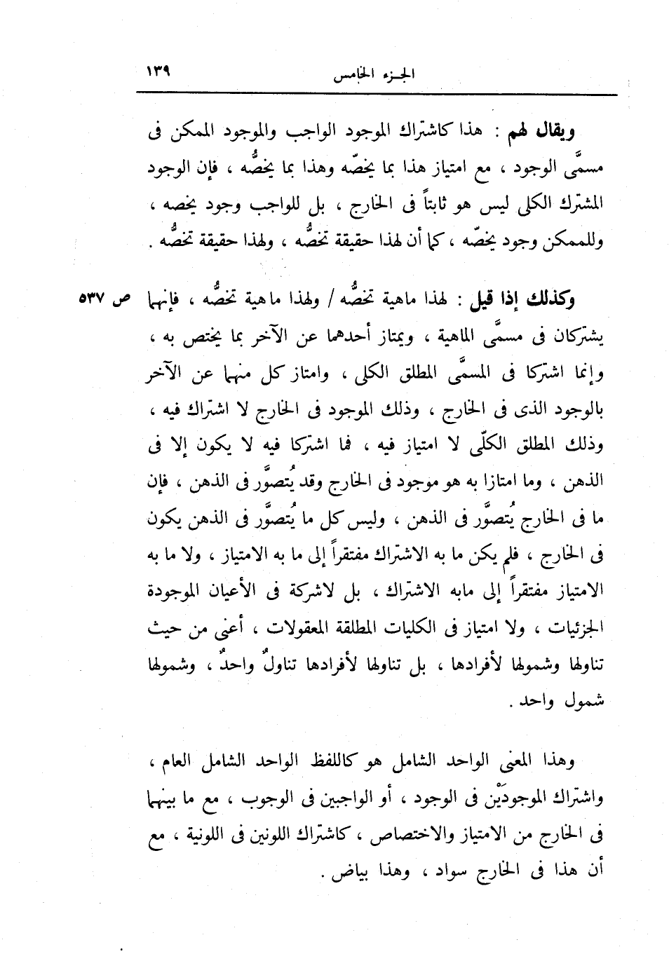 وكذلك إذا قيل لهذا ماهية تخصه ولهذا ماهية تخصه، فإنهما يشتركان في مسمى الماهية، ويمتاز أحدهما عن الآخر بما يختص به وإنما اشتركا في المسمى المطلق الكلي، وامتاز كل منهما عن الآخر بالوجود الذي في الخارج، وذلك لا يكون إلا في الذهن، وما امتازا به هو موجود في الخارج وقد يتصور في الذهن، فإن ما في الخارج يتصور في الذهن، وليس كل ما يتصور في الذهن يكون في الخارج، فلم يكن ما به الاشتراك مفتقراً إلى ما به الامتياز، ولا ما به الامتياز مفتقراً إلى ما به الاشتراك، بل لاشركة في الأعيان الموجودة الجزئيات، ولا امتياز في الكليات المطلقة بالمعقولات، أعني من حيث تناولها وشمولها لأفرادها بل تناولها لأفرادها تناول واحد وشمولها شمول واحد.