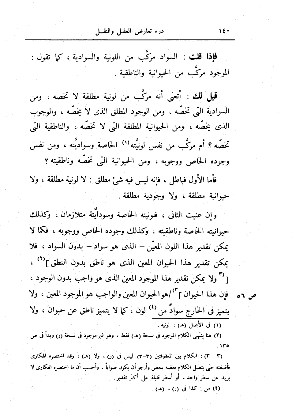 قيل لك أتعني أنه مركب من لونية مطلقة لا تخصه، ومن السوادية التي تخصه، ومن الوجود المطلق الذي لا يخصه والوجوب الذي يخصه ومن الحيوانية المطلقة التي لا تخصه والناطقية التي تخصه؟ أم مركب من نفس لونيته الخاصة وسواديته ومن نفس وجوده الخاص ووجوبه ومن الحيوانية التي تخصه وناطقيته؟