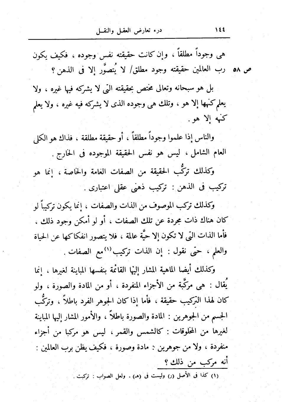 وكذلك أيضاً الماهية المشار إليها القائمة بنفسها المباينة لغيرها، إنما يقال هي مركبة من الأجزاء المنفردة، أو من المادة والصورة، ولو كان لهذا التركيب حقيقة، فأما إذا كان الجوهر الفرد باطلاً، وتركب الجسم من الجوهرين: المادة والصورة باطلاً، والأمور المشار إليها المباينة لغيرها من المخلوقات: كالشمس والقمر ليس هو مركباً من أجزاء منفردة، ولا من جوهرين: مادة وصورة فكيف يظن برب العالمين أنه مركب من ذلك؟