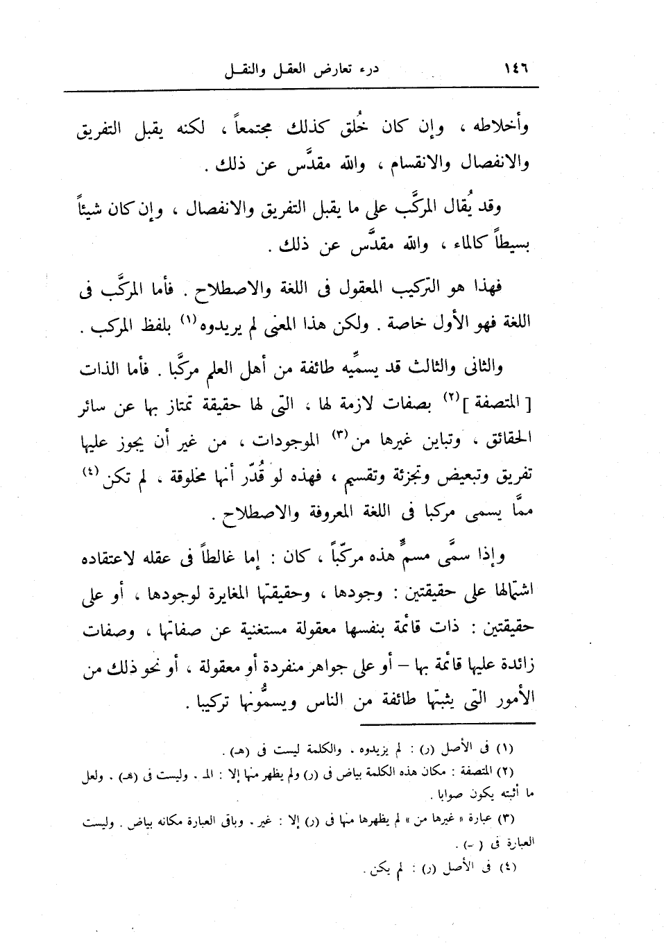 والثاني والثالث قد يسميه طائفة من أهل العلم مركباً فأما الذات المتصفة بصفات لازمة لها التي لها حقيقة تمتاز بها عن سائر الحقائق وتباين غيرها من الموجودات من غير أن يجوز عليها تفريق وتبعيض وتجزئة وتقسيم فهذه لو قدر أنها مخلوقة لم تكن مما يسمى مركباً في اللغة المعروفة والاصطلاح.