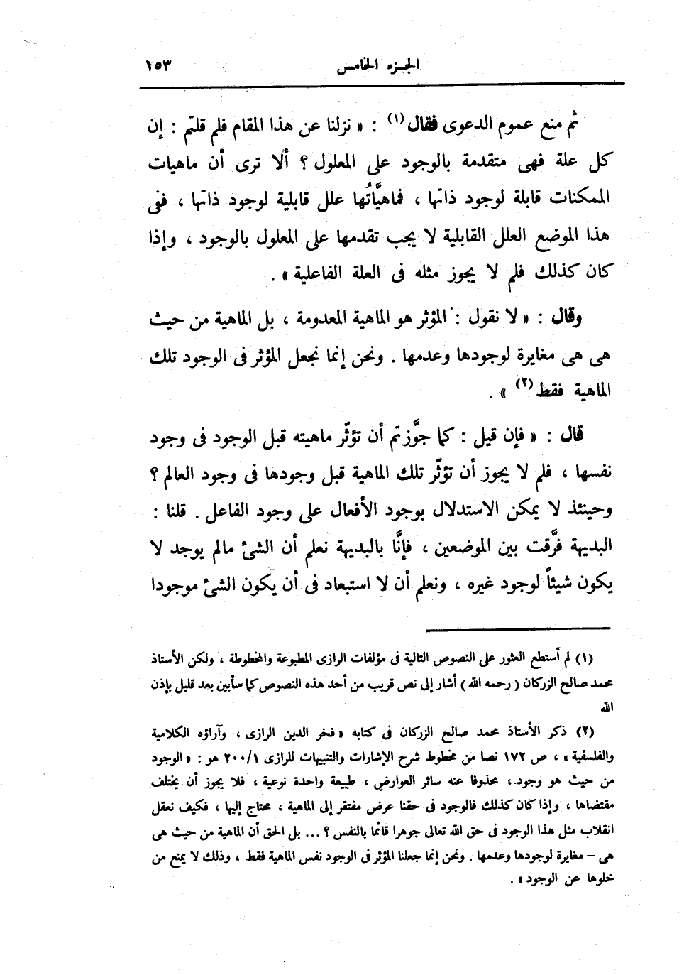 قال فإن قيل كما جوزتم أن تؤثر ماهيته قبل الوجود في وجود نفسها فلم لا يجوز ان تؤثر تلك الماهية قبل وجودها في وجود العالم وحينئذ لا يمكن الاستدلال بوجود الأفعال على وجود الفاعل قلنا البديهية فرقت بين الموضعين فإنا بالبديهية نعلم أن الشيء ما لم يوجد لا يكون شيئاً لوجود غيره ونعلم أن لا استبعاد في أن يكون الشيء موجوداً