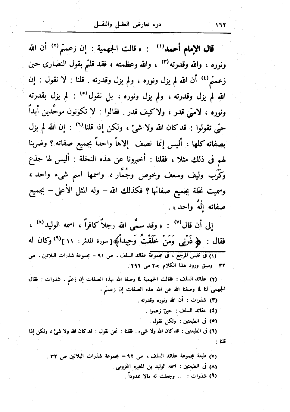 قال الإمام احمد قالت الجهمية إن زعمتم ان الله ونوره والله وقدرته والله وعظمته فقد قلتم بقول النصارى حين زعمتم ان الله لم يزل ونوره، ولم يزل وقدرته قلنا لا نقول إن اله لم يزل وقدرته ولم يزل ونوره بل نقول لم يزل بقدرته ونوره، لا متى قدر ولا كيف قدر فقالوا لا تكونون موحدين أبداً حتى تقولوا قد كان الله ولا شيء ولكن إذا قلنا إن الله لم يزل بصفاته كلها، أليس إنما نصف إلاهاً واحداً بجميع صفاته وضربنا لهم في ذلك مثلا فقلنا أخبرونا عن هذه النخلة أليس لها جذع وكرب وليف وسعف وخوض وجمار واسمها اسم شيء واحد وسميت نخلة بجميع صفاتها فكذلك الله وله المثل الأعلى بجميع صفاته إله واحد.