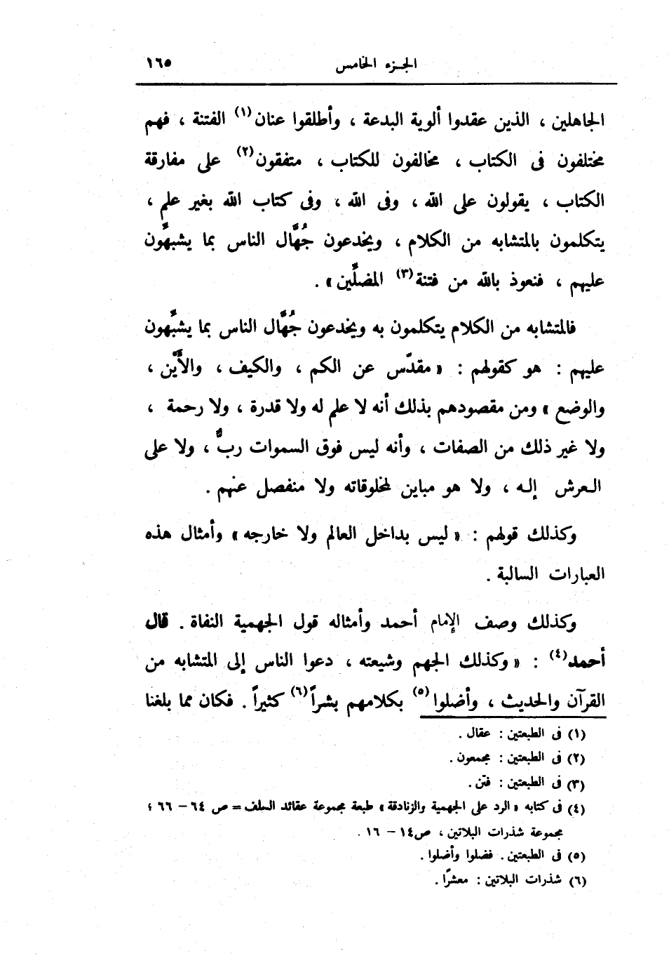 وكذلك وصف الإمام احمد وأمثاله قول الجهمية النفاة قال أحمد وكذلك الجهم وشيعته دعوا الناس إلى المتشابه من القرآن والحديث وأضلوا بكلامهم بشراً كثيراً فكان مما بلغنا