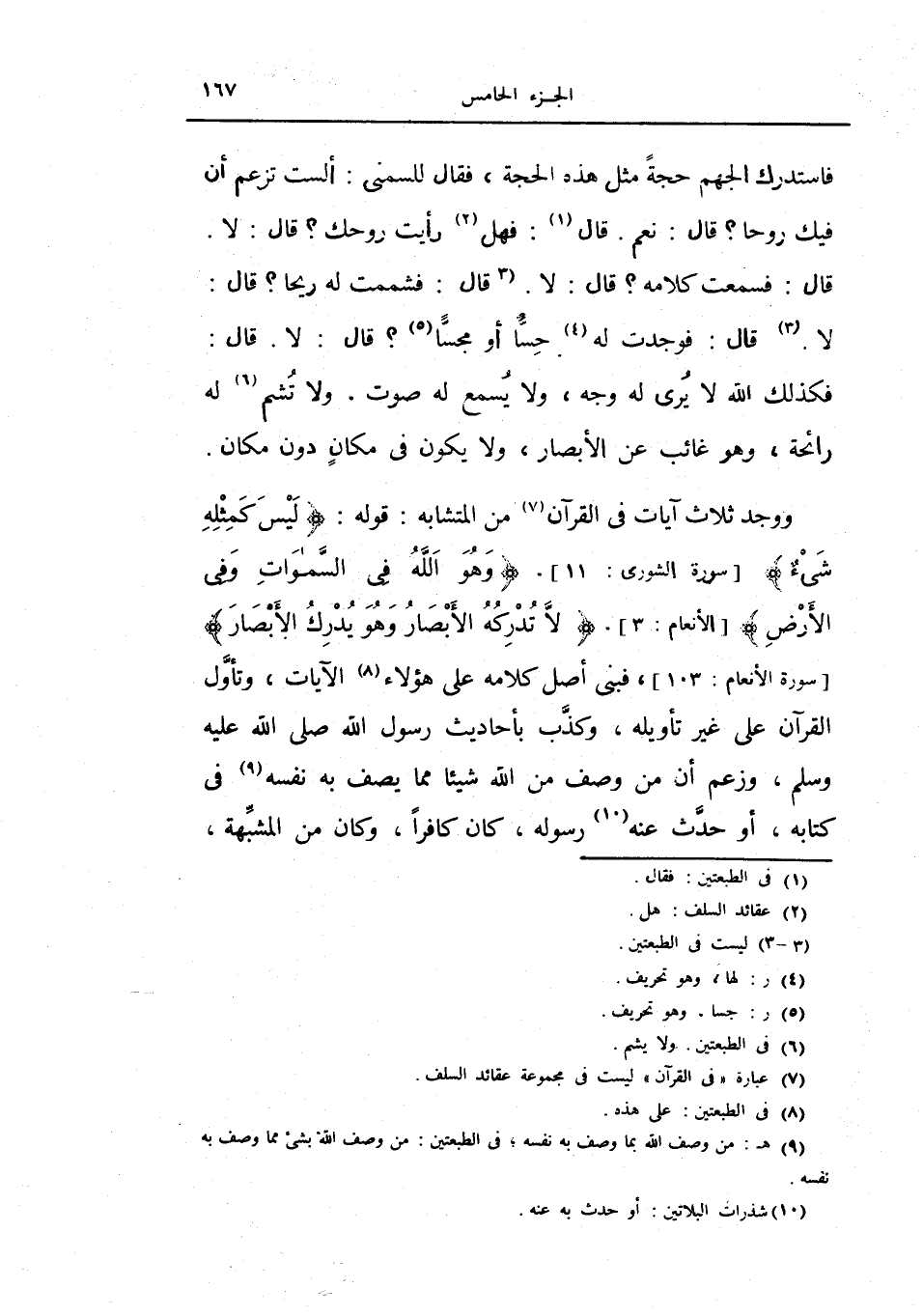 ووجد ثلاث آيات في القرآن من المتشابه قوله {ليس كمثله شيء} الشورى: 11، {وهو الله في السموات وفي الأرض} الأنعام: 3، {لا تدركه الأبصار وهو يدرك الأبصار} ، الأنعام ك 103، فبنى أصل كلامه على هؤلاء الآيات وتأول القرآن على غير تأويله وكذب بأحاديث رسول الله صلى الله عليه وسلم وزعم أن من وصف من الله شيئاً مما يصف به نفسه في كتابه أو حدث عنه رسوله كان كافراً وكان من المشبهة،