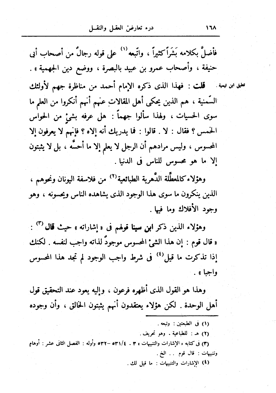 وهؤلاء كالمعطلة الدهرية الطبائعية من فلاسفة اليونان ونحوهم، الذين ينكرون سوى هذا الوجود الذي يشاهده الناس ويحسونه، وهو وجود الأفلاك وما فيها.