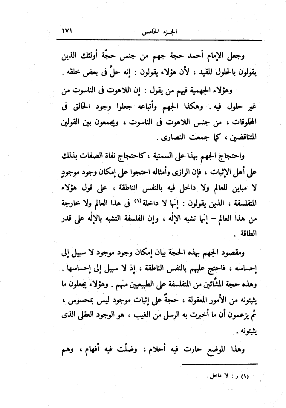 واحتجاج الجهم بهذا على السمنية، كاحتجاج نفاة الصفات بذلك على أهل الإثبات، فإن الرازي وأمثاله احتجوا على إمكان وجود موجود لا مباين للعالم ولا داخل فيه بالنفس الناطقة، على قول هؤلاء المتفلسفة، الذين يقولون: إنها لا داخلة في هذا العالم ولا خارجة من هذا العالم إنها تشبه الإله وإن الفلسفة التشبه بالإله على قدر الطاقة.
