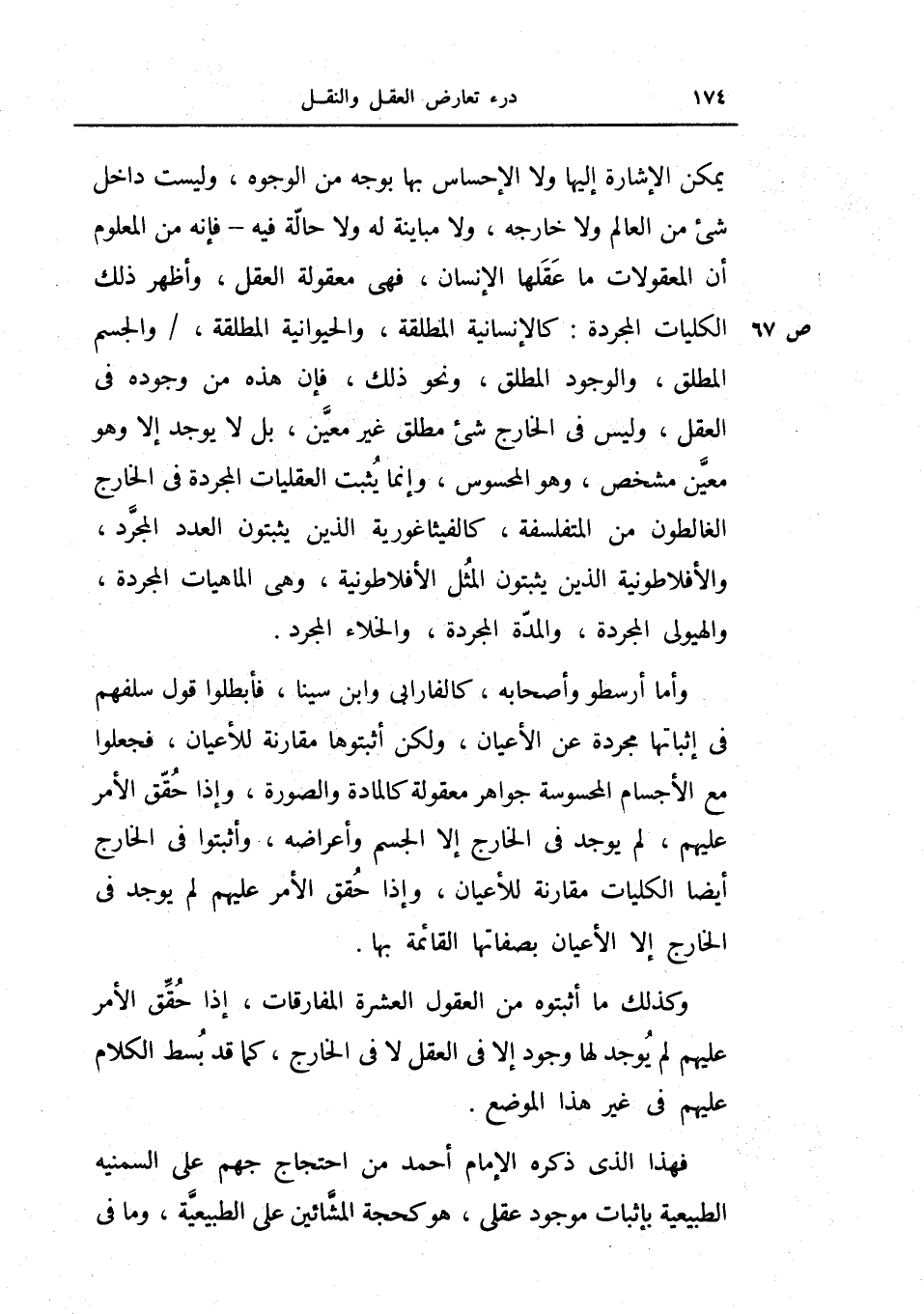 يمكن الإشارة إليها ولا الإحساس بها بوجه من الوجوه، وليست داخل شيء من العالم ولا خارجة ولا مباينة له ولا حالة فيه فإنه من المعلوم أن المعقولات ما عقلها الإنسان، فهي معقولة العقل، وأظهر ذلك الكليات المجردة: كالإنسانية المطلقة، والحيوانية المطلقة، والجسم المطلق، والوجود المطلق، ونحو ذلك، فإن هذه من وجوده في العقل، وليس في الخارج شيء مطلق غير معين، بل لا يوجد إلا وهو معين مشخص، وهو المحسوس، وإنما يثبت العقليات المجردة في الخارج الغالطون من المتفلسفة كالفيثاغورية الذين يثبتون العدد المجرد، والأفلاطونية الذين يثبتون المثل الأفلاطونية، وهي الماهيات المجردة، والهيولى المجردة، والمدة المجردة، والخلاء المجرد.