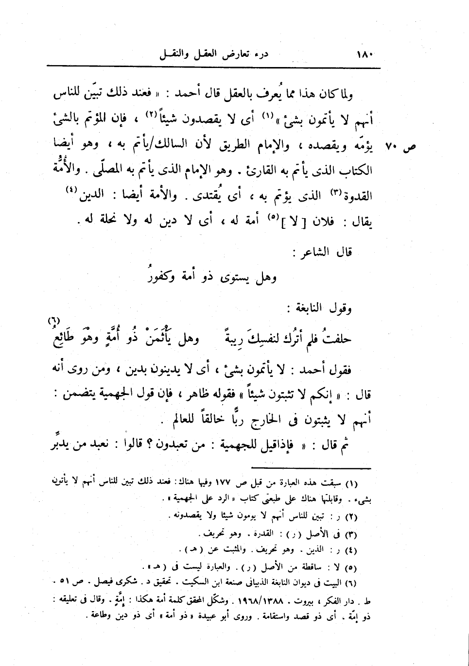 ولما كان هذا مما يعرف بالعقل قال أحمد فعند ذلك تبين للناس أنهم لا يأتمون بشيء أي لا يقصدون شيئاً فإن المؤتم بالشيء يؤمه ويقصده والإمام الطريق لأن السالك يأتم به وهو أيضاً الكتاب الذي يأتم به القارىء وهو الإمام الذي يأتم به المصلي.