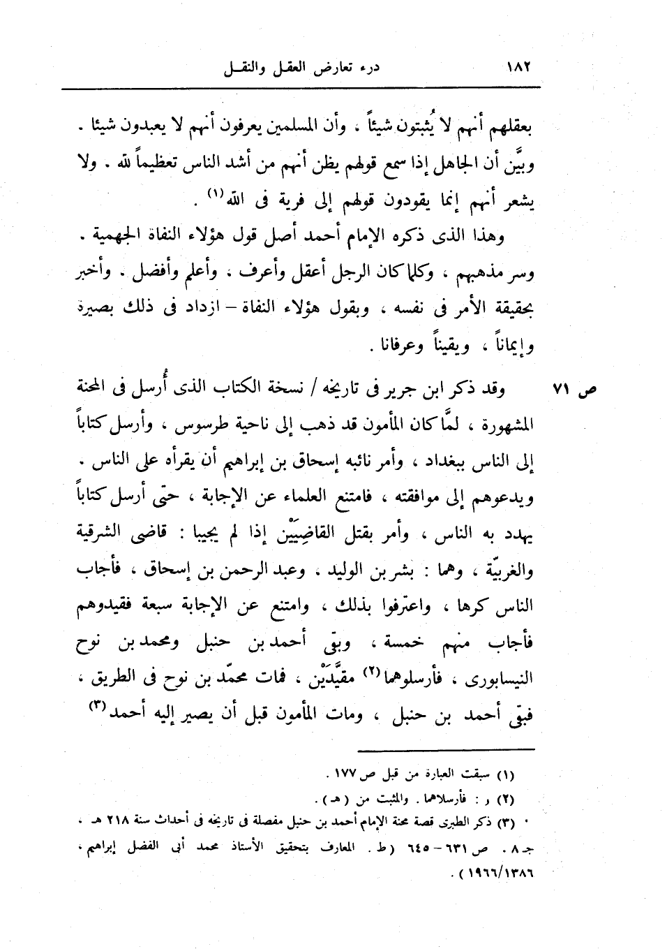 وهذا الذي ذكره الإمام أحمد أصل قول هؤلاء النفاة الجهمية، وسر مذهبهم، وكلما كان الرجل أعقل وأعرف، وأعلم وأفضل، وأخبر بحقيقة الأمر في نفسه، وبقول هؤلاء النفاة أزداد في ذلك بصيرة وإيماناً ويقيناً وعرفانا.
