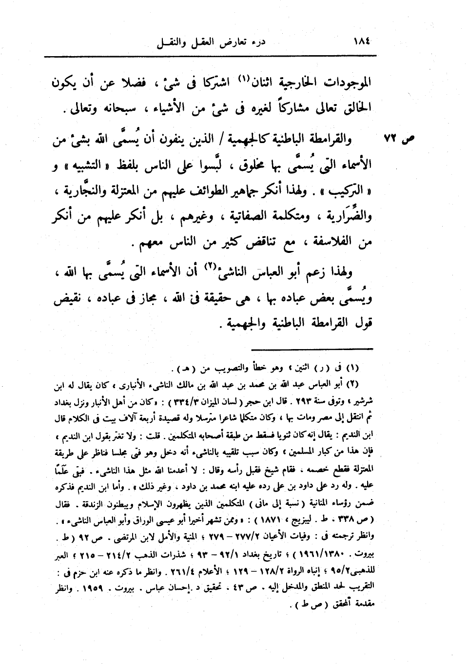 ولهذا زعم أبو العباس الناشيء أن الأسماء التي يسمى بها الله، ويسمى بعض عباده بها هي حقيقة في الله مجاز في عباده نقيض قول القرامطة الباطنية والجهمية.