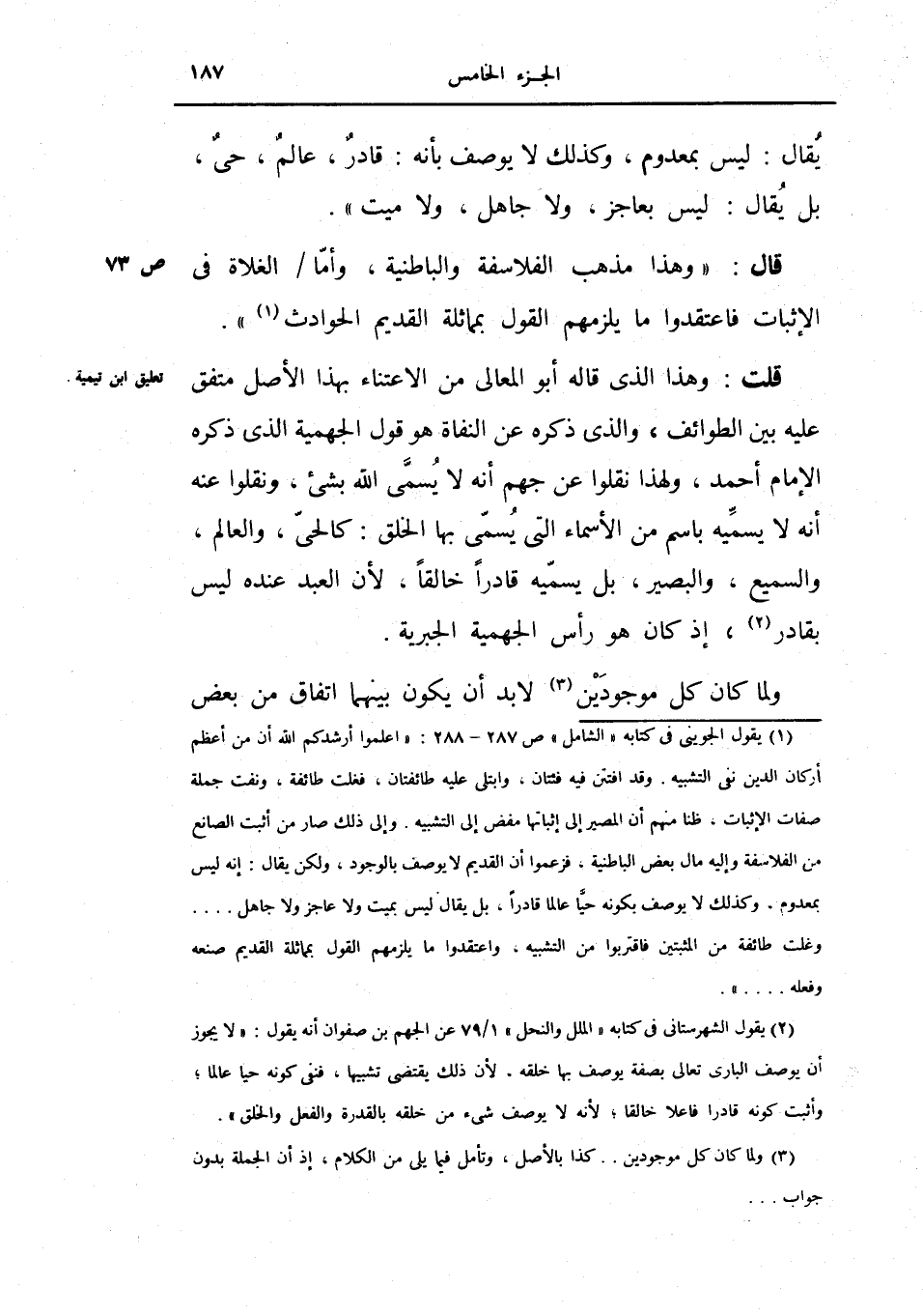 قلت: وهذا الذي قاله أبو المعالي من الاعتناء بهذا الأصل متفق عليه بين الطوائف، والذي ذكره عن النفاة هو قول الجهمية الذي ذكره الإمام أحمد ولهذا نقلوا عن جهم أنه لا يسمى الله بشيء ونقلوا عنه أنه لا يسميه باسم من الأسماء التي يسمي بها الخلق: كالحي والعالم والسميع والبصير بل يسميه قادراً خالقاً لأن العبد عنده ليس بقادر إذ كان هو رأس الجهمية الجبرية.