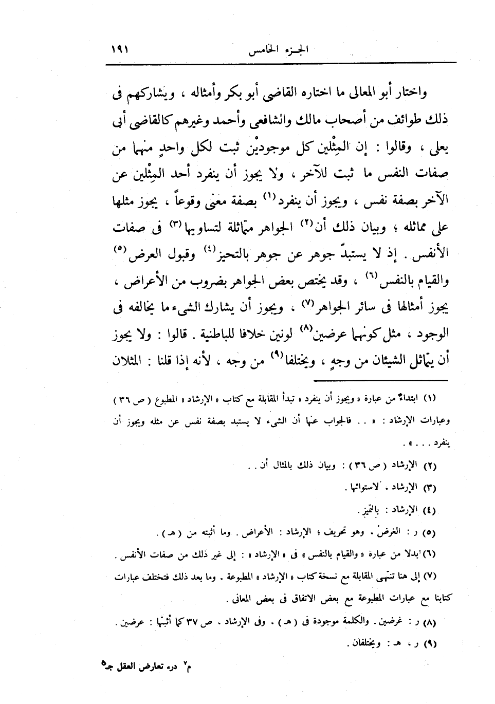 واختار أبو المعالي ما اختاره القاضي أبو بكر وأمثاله ويشاركهم في ذلك طوائف من أصحاب مالك والشافعي وأحمد وغيرهم كالقاضي أبي يعلي وقالوا: إن المثلين كل موجودين ثبت لكل واحد منهما من صفات النفس ما ثبت للآخر ولا يجوز أن ينفرد أحد المثلين عن الآخر بصفة نفس، ويجوز أن ينفرد بصفة معنى وقوعاً يجوز مثلها على مماثلة وبيان ذلك أن الجواهر متماثلة لتساويها في صفات الأنفس.